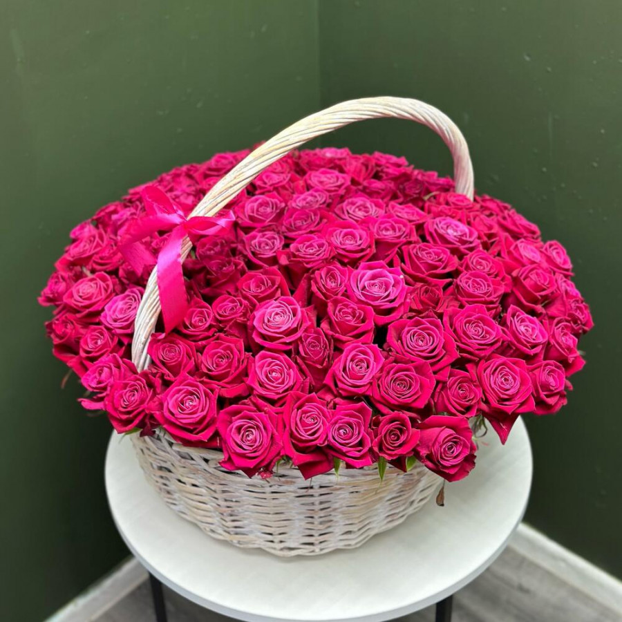 На фото 101 малиновая роза в корзине. В составе: роза 101 шт, оазис флористический 3 шт, корзина (xl) 1 шт, . Все цветы свежие и ароматные, букет красиво оформлен и отлично подходит для подарка. Доступна доставка цветов или самовывоз.