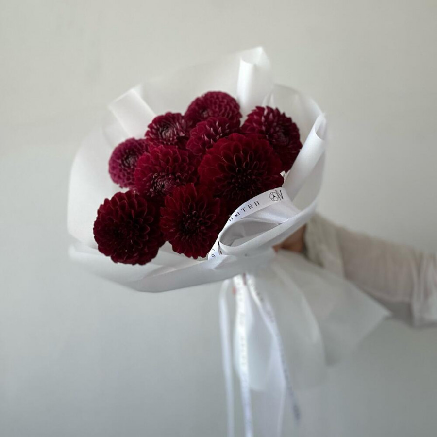 На фото букет из 9 бордовых георгин. В составе: георгина 9 шт, дизайнерская упаковка 2 шт, атласная лента 1 шт, . Все цветы свежие и ароматные, букет красиво оформлен и отлично подходит для подарка. Доступна доставка цветов или самовывоз.